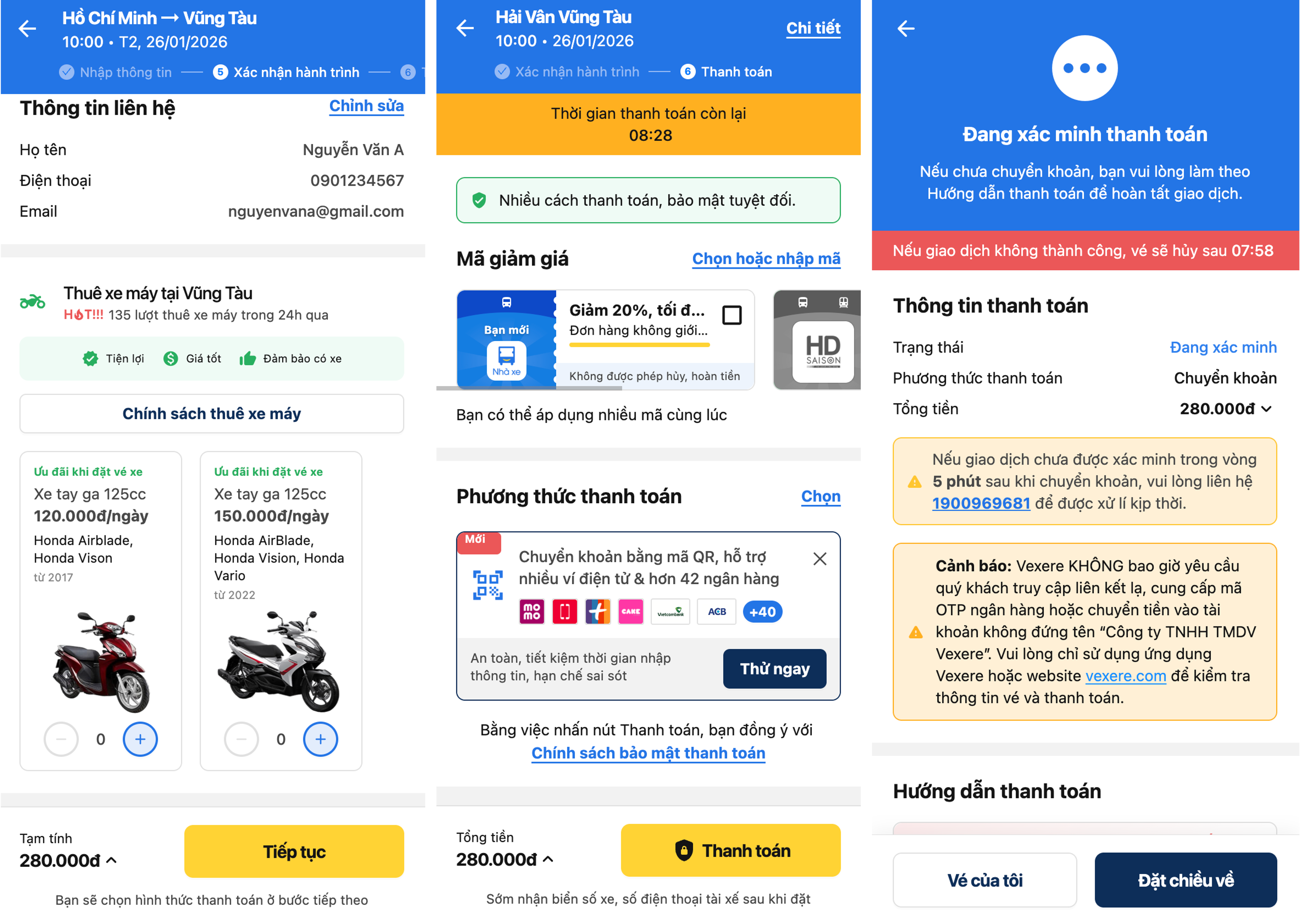 Bước 3: Xác nhận lại thông tin đặt vé và chọn hình thức thanh toán phù hợp. Tiến hành thanh toán và chờ lên xe.
