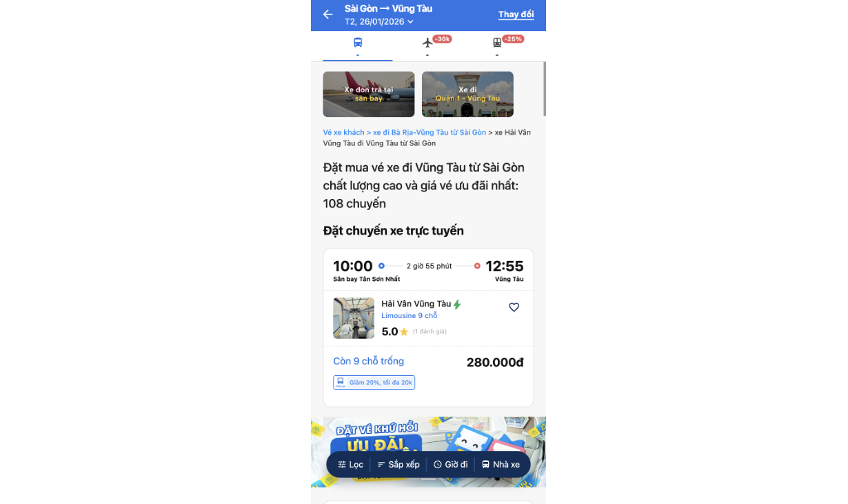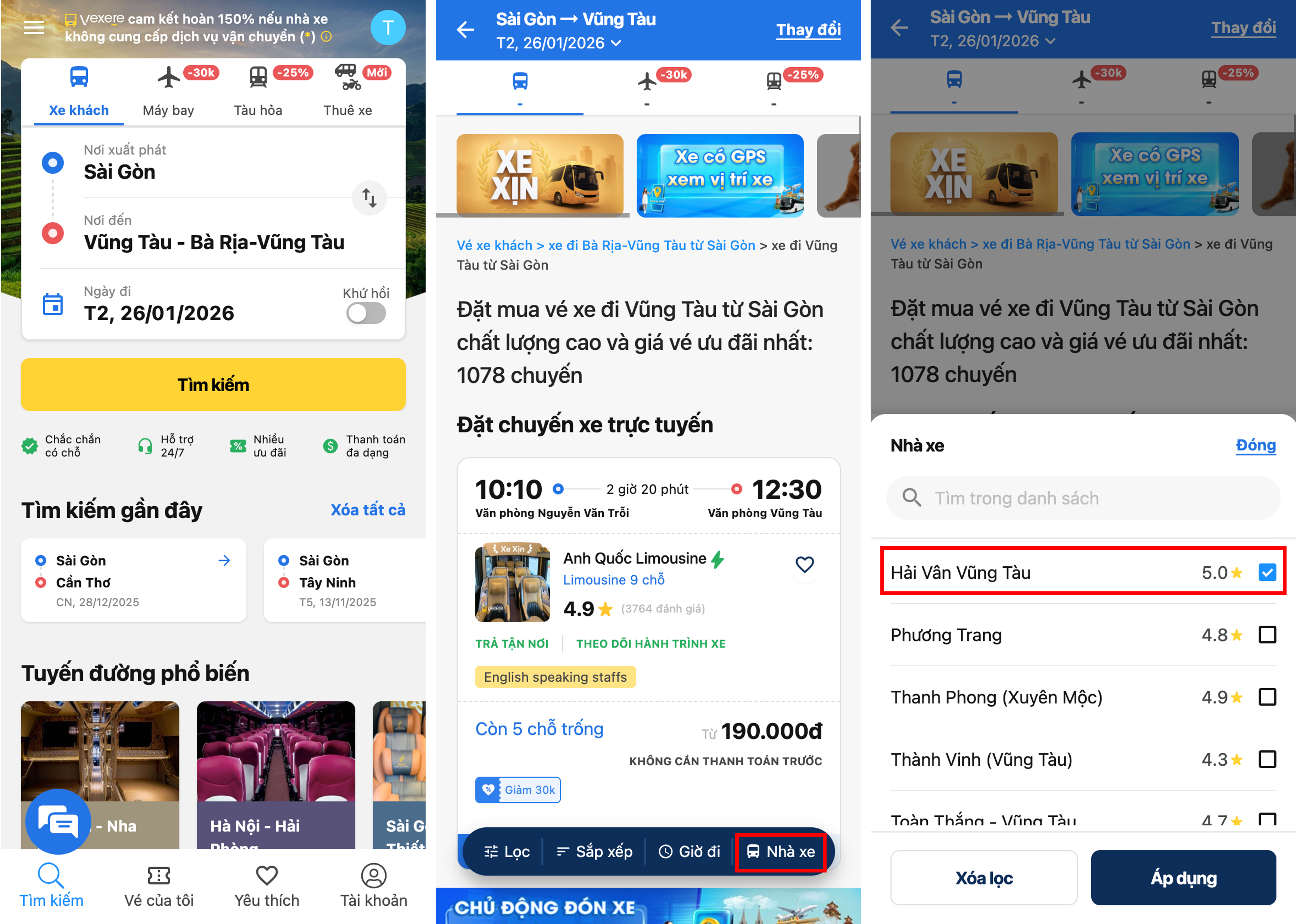 Bước 1: Vào Vexere.com, chọn điểm đi/ điểm đến là Sài Gòn - Vũng Tàu. Sau đó dùng bộ lọc chọn xe Hải Vân Vũng Tàu .